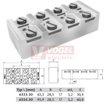 Parametry 6354-30 svorkovnice keramická, 6x4mm2/400V, IP00, mont.rozteč 60,8mm