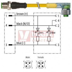 Parametry 7000-40321-0230300 konektor M12/3-pin/vidl/přímý - kabel ŽL PUR/PVC 3x0,34mm2 L=3,0m - konektor M12/3-pin/2xLED/zás/úhlový