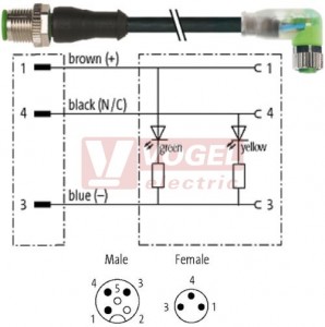 7000-40641-0100060 konektor M12/3-pin/vidl/přímý - kabel ŽL PVC 3x0,25mm2 L=0,6m - konektor M8/3-pin/2xLED/zás/úhlový
