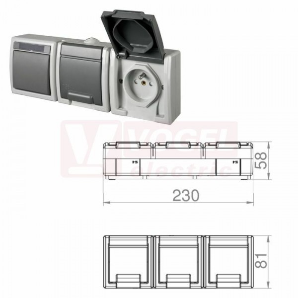 Kombinace IP55 6 +2z. 19094 ATLAS Přepínač č.6+ 2x zásuvka 2x 2P+PE, vodorovně, na povrch, tělo šedé RAL7035, víčko šedý RAL7043, IK07, šroubové připojení, materiál ABS+TPE, rozměr 81x230x56mm