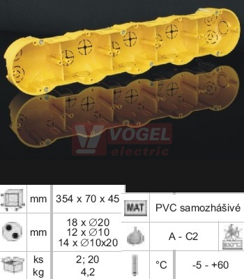 Parametry KP 64/5L_NA krabice přístrojová, 5-nás., do sádrokartonu, š/v/hl 354x71x45mm, IP30, PVC
