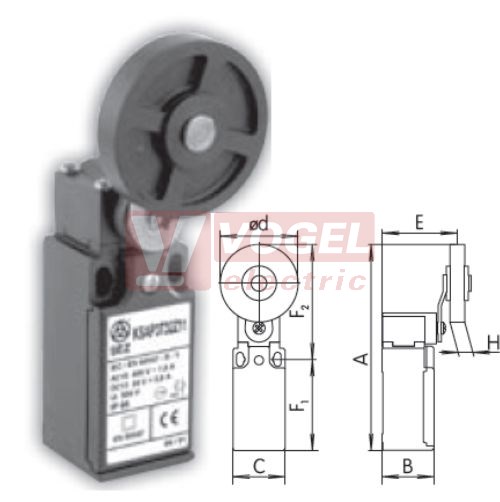 KSAP3T42X11 Koncový spínač s pákou a gumovou kladkou pr.50mm, 1Z+1V, bez mžikové funkce, bez přesahu, kabel.vstup 1x PG11, 122x30x30,3mm, IP65