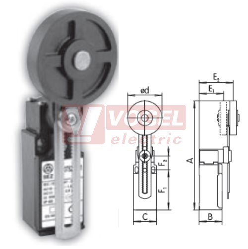 KSAP3T5200W20 Koncový spínač s nastavitelnou ozubenou pákou a gum. kladkou pr.50mm, 2Z, bez mžikové funkce, kabel.vstup 1xPG11, 126,5-186,5x30x30,3mm, IP65