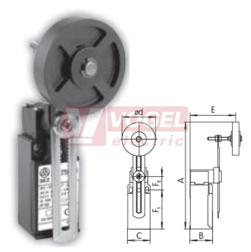 KSAP3T5500W20 Koncový spínač s nastavitelnou ozubenou pákou a gum. nastavitelnou kladkou pr.50mm, 2Z, bez mžikové funkce, kabel.vstup 1xPG11, 114,5-186,5x30x30,3mm, IP65
