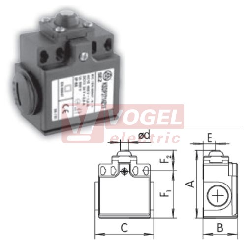 Parametry KSDP3T14Z02 Koncový spínač s kovovým čepem a prachotěsnou manžetou, 2V, s mžikovou funkcí, kabel.vstup 2xPG11, 66x33x57mm, IP65