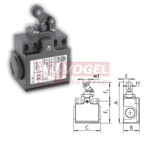 Parametry KSDP3T35X11 Koncový spínač s pákou a plastovou kladkou, s kov.čepem a prachotěsnou manžetou 12,5mm, 1Z+1V, bez mžikové funkce, bez přesahu, kabel.vstup 2xPG11, 85x33x57mm, IP65