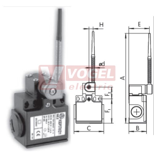 KSDP3T61Z11 Koncový spínač ovládaný nerezovou pružinou s nylónovým nástavcem 7mm, 1Z+1V, s mžikovou funkcí, kabel.vstup 2xPG11, 170x33x57mm, IP65