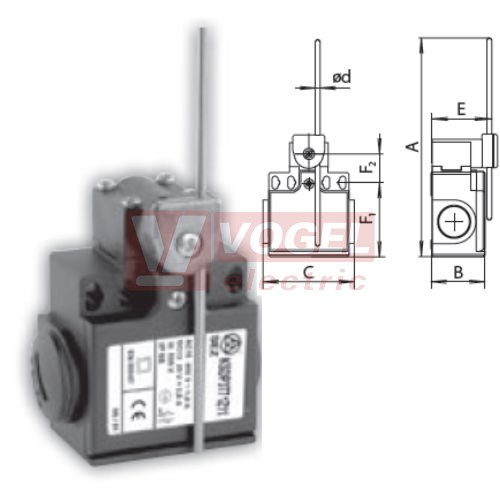 Parametry KSDP3T72W02 Koncový spínač ovládaný sklolaminátová tyčka 3mm, 2V, bez mžikové funkce, kabel.vstup 2xPG11, 223,5x33x57mm, IP65