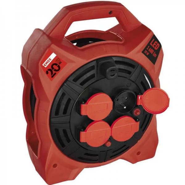 Prodluž.bubnový 25m/4Z EMOS, GUMA s LED reflektorem 1600lm H05RR-F 3x1,5mm2, IP44, ČE, 230V/13A, 1000W navinutý/3000W rozvinutý, tep.pojistka, zásuvky CZ kolík (P08420)