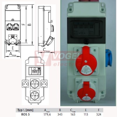 ROS 5/I-15 zásuvková rozvodnice 1xIE 3253+1xIE1653+2x230V/16A- jištěná IP44