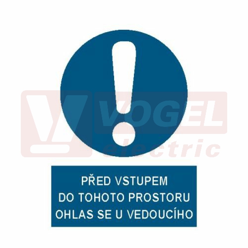 Samolepka příkazová "Před vstupem do tohoto prostoru ohlas se u vedoucího" (bílý tisk, modrý podklad), symbol s textem (3901) A4