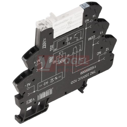 Parametry TRZ 230VUC 1CO AU paticové relé TERMSERIE, 1 přepínací kontakt, 6A/250VAC AgNi pozlacené, LED indikace zelená, test.tlač. NE, patice pružinová, š=6,4mm (1123180000)
