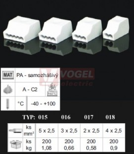 Parametry TYP018_XX svorka bezšroubová žlutá/čirá, rozměr 17,2x9,5x9,5mm, průřez vodiče 4x 1-2,5mm2, max. zatížení 24A, pro napětí do 450V, PA