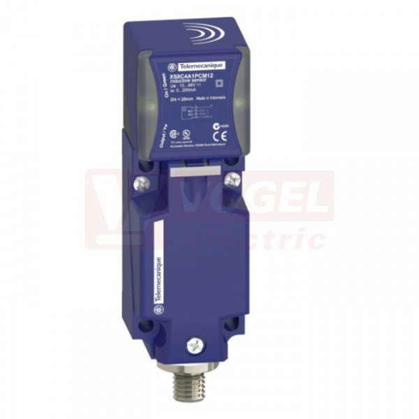 Parametry XS8C4A1PCM12 Indukční čidlo 40x40x117mm, 5-polohové, 12…48VDC, Sn=20mm, stíněný, plast, 4-vodiče, PNP/NO+NC, konektor samec M12/4pin, IP65/67/69K