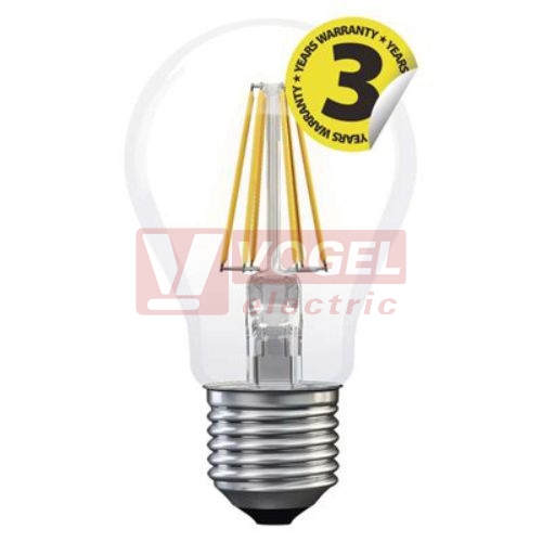 Parametry Žárovka LED E27 230VAC 6W klasik A60 A++, provedení FILAMENT, baňka čirá, neutrální bílá 4100K, 806 lumen, nestmívatelná, živ. 25000h., náhrada za 60W, rozměr 60x110mm (EMOS-Z74261)