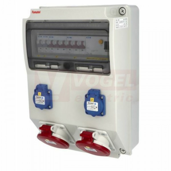 Zásuvková skříň ZSF20002000.1 /3959 IP54 jištěná 10kA s chráničem 40/4/003, zásuvky 2x230V/16A/3p, 2x400V/32A/5p, rozměry 398x266x153mm, (jistič 2xB16/1, 2xB32/3)