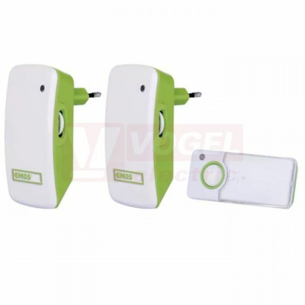 Zvonek domovní bezdrátový P5742, barva bílá/zelená, dosah 100m, 2 přijímače 230VAC, 3melodie, tlačítko 1x12V A23, náhradní P5740T, signalizace na tlačítku,85dB, 433MHz (P5742)